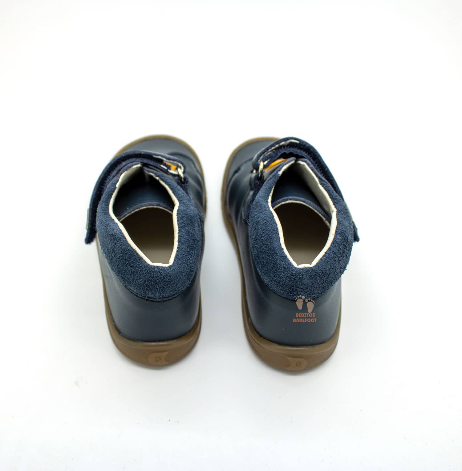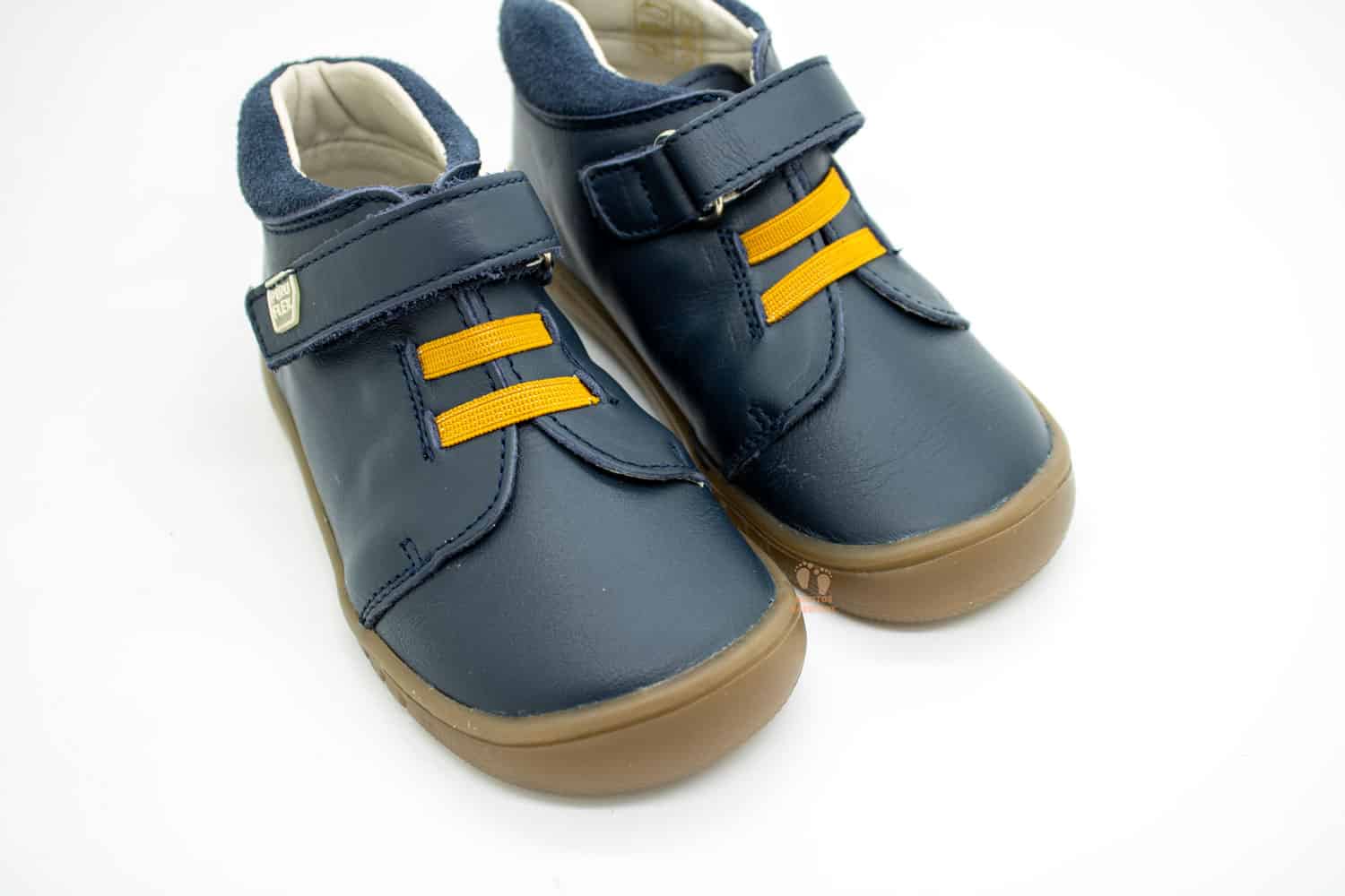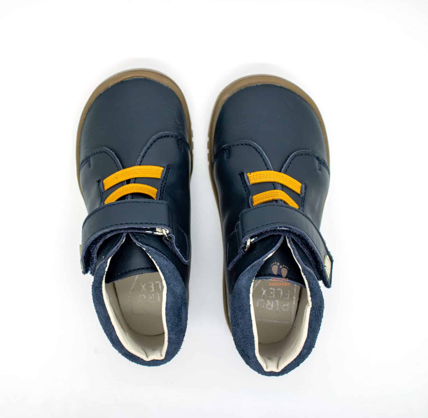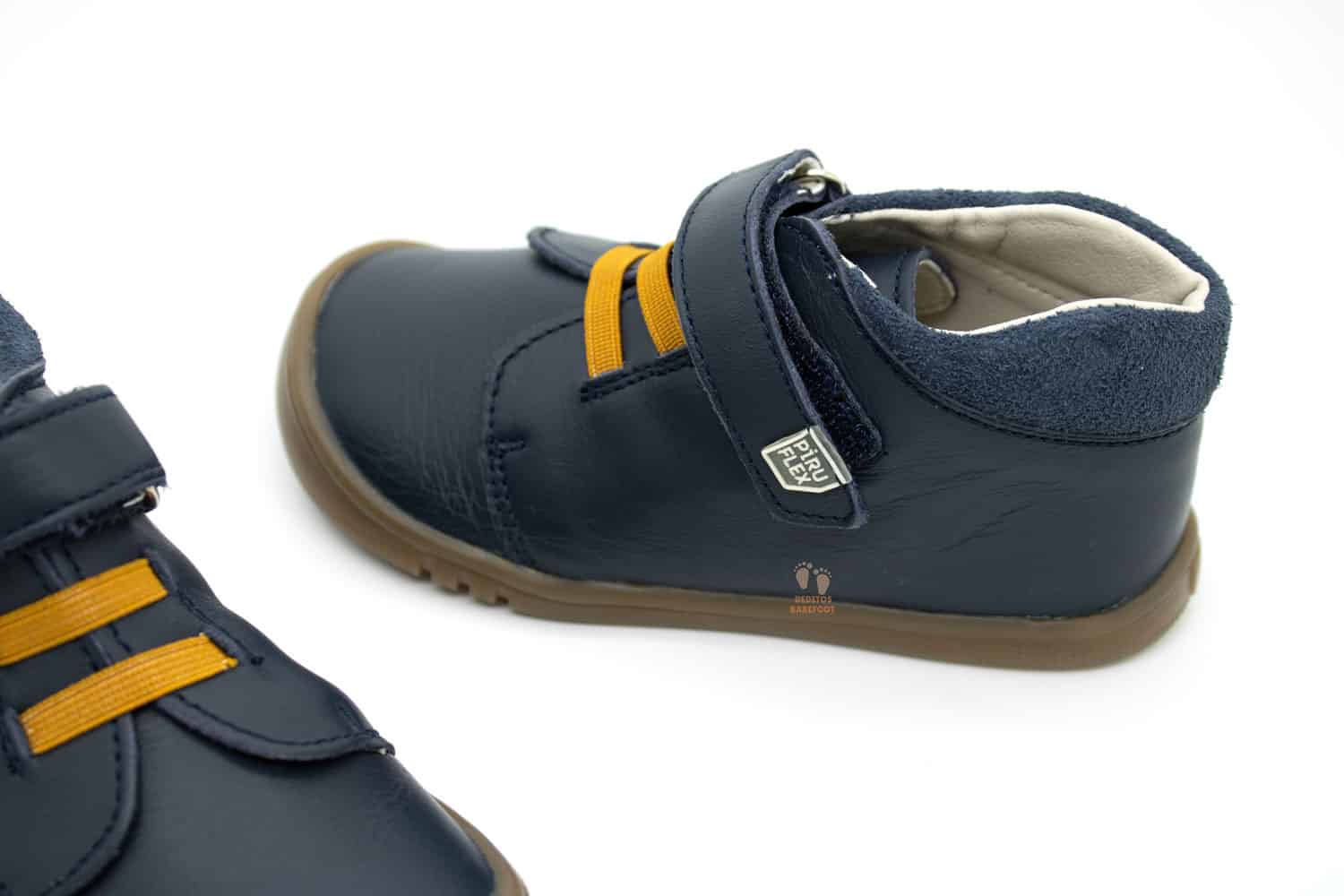 El cierre de estos zapatos barefoot, creado por la reconocida marca española Pirufin, es de velcro + cordones elásticos, el velcro de la largo recorrido es de color del calzado y donde se puede observar el logo de la marca, Piruflex. Los cordones decorativos son en color mostaza, dando un toque de color a estos botines barefoot. Este cierre de velcro fomenta la autonomía de los niños, ya que les permite ponerse los zapatos fácilmente por sí mismos.