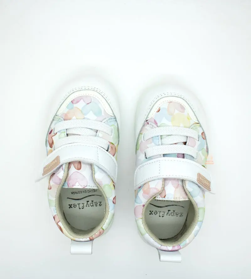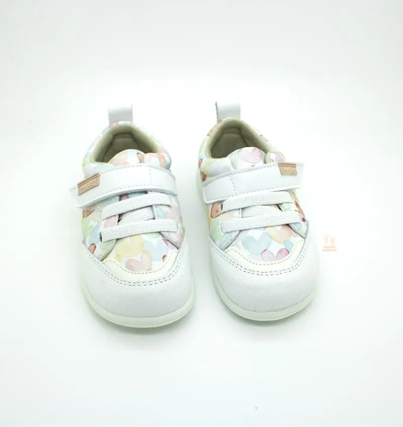 • CHOPO BLANCO (base en color blanco con estampado de corazones de colores con velcro y cordones elásticos). Ref: AJ201401