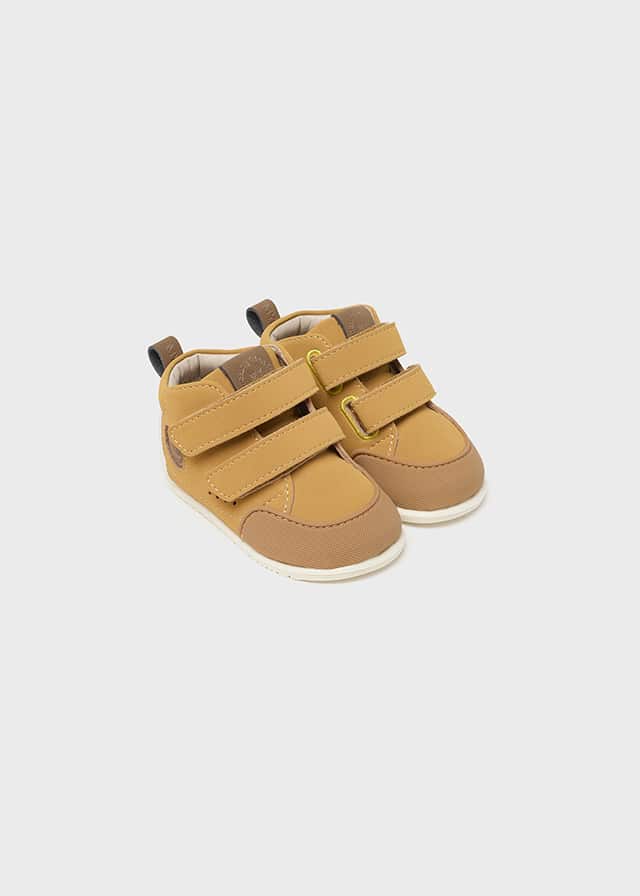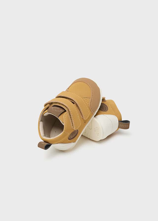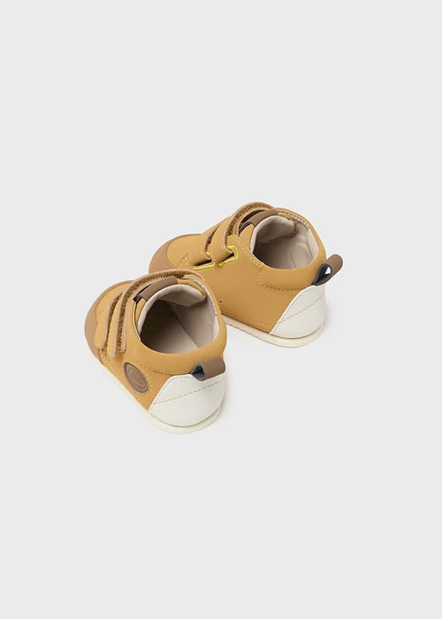 Este calzado respetuoso de primeros pasos están confeccionadas con POLIPIEL o también llamado cuero sintético (es un zapato respetuoso vegano) tanto en la parte superior como en el interior. Su cierre, compuesto por DOS VELCROS en color mostaza, facilita la colocación y promueve la autonomía de los más pequeños ya que es importante que los niños empiecen a calzarse solos gradualmente.
