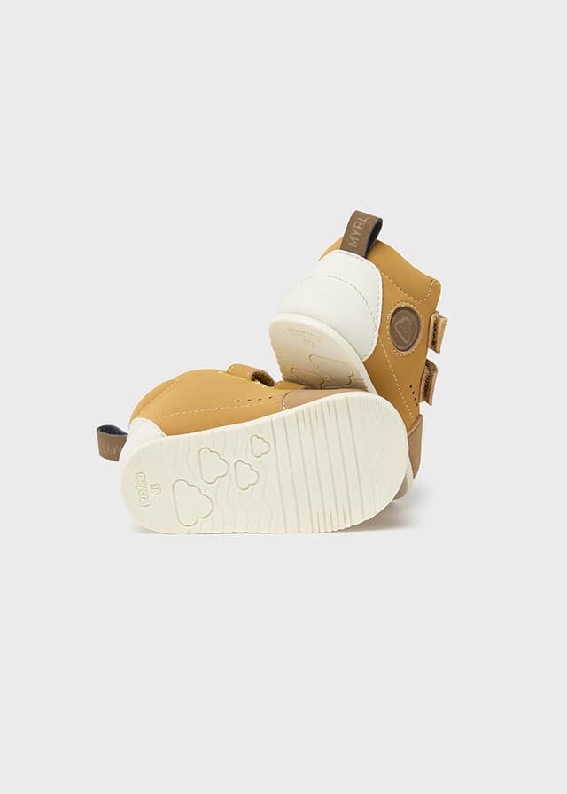Este modelo ha sido diseñado con una base en tono mostaza + algún detalle en color marrón y blanco, obteniendo un diseño espectacular para esta primera colección de Mayoral en el mundo del calzado respetuoso. En los laterales encontramos perforaciones decorativas.